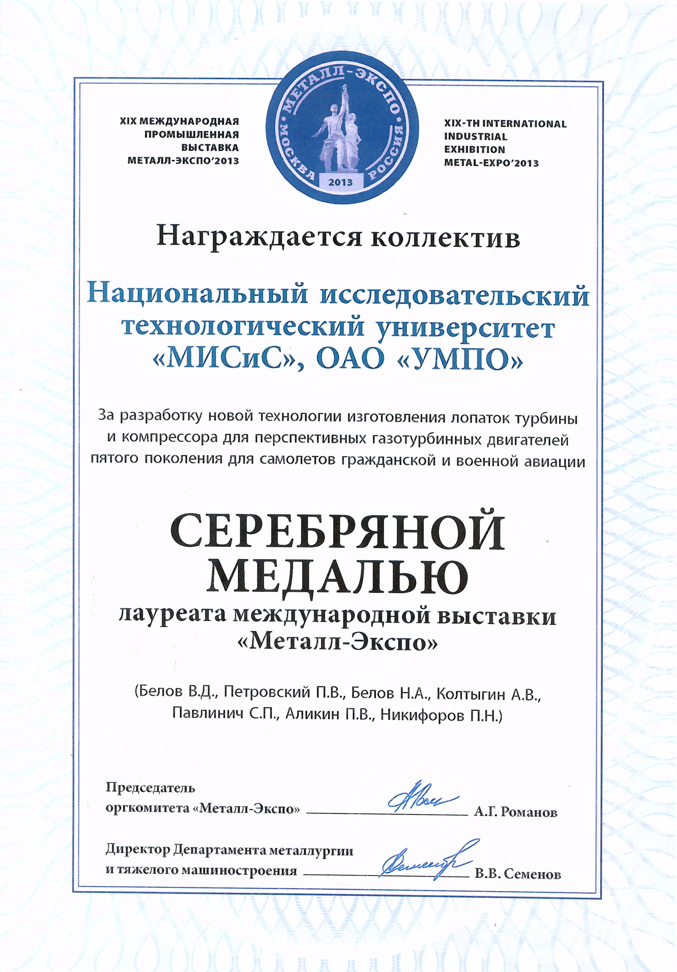 Серебряной медалью лауреата «За разработку новой технологии изготовления лопаток турбины и компрессора для перспективных газотурбинных двигателей пятого поколения для самолетов гражданской и военной авиации», реализованную в рамках Госконтракта № 14.527.12.0009 от 11.10.2011 г., были награждены коллективы:
