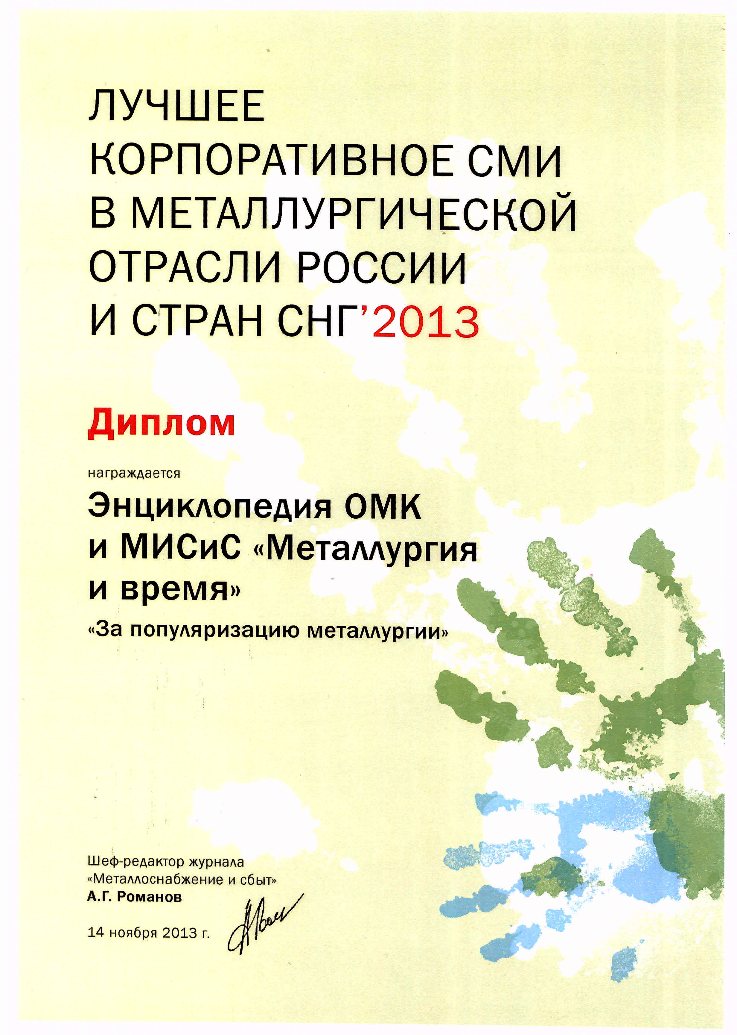 Дипломом за победу в конкурсе «Лучшее корпоративное издание в металлургической отрасли России и стран СНГ» в номинации «За популяризацию металлургии» награждена Энциклопедия ОМК и МИСиС «Металлургия и время».