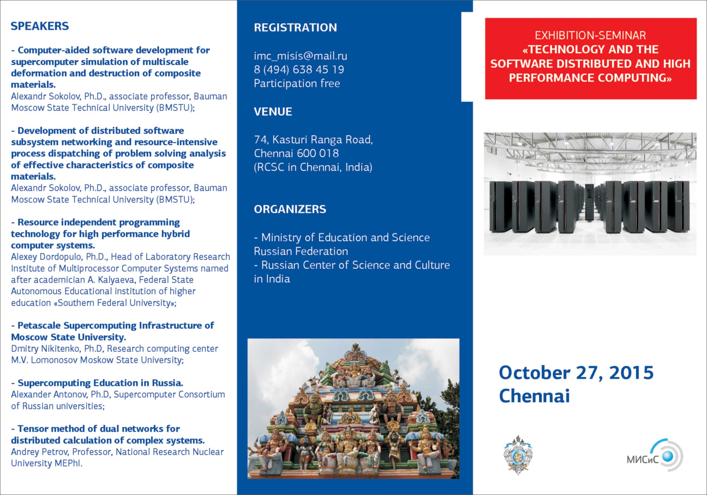 Международная выставка — семинар «Технологии и программное обеспечение распределенных и высокопроизводительных вычислительных систем» состоится на базе РЦНК в г.Ченнаи, Индия, 27 октября 2015 г. Мероприятие проводится в соответствии со Сводным планом на 2015 г. информационно-выставочной деятельности Министерства образования и науки РФ.