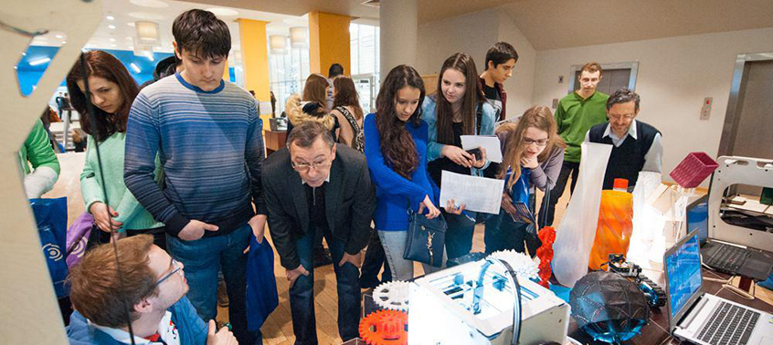 Пространство холла в Главном корпусе и ДК МИСиС заполнила яркая интерактивная часть мероприятия: выставка Цифрового персонального производства — знаменитый FabLab НИТУ «МИСиС», презентации молодежных объединений университета, а также концерт творческих коллективов вуза.