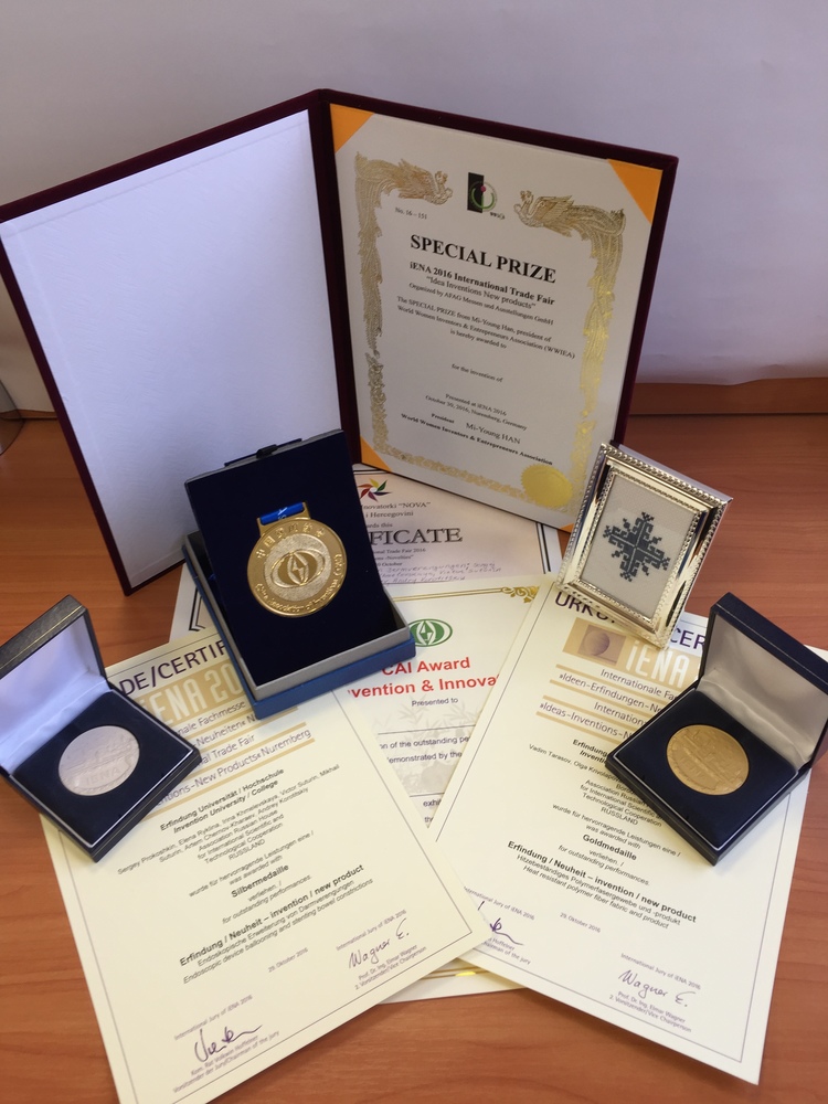 Впервые представленное на iENA-2016 изобретение научной группы НИТУ «МИСиС» под руководством профессора Вадима Тарасова — «Термостойкая ткань из полимерных волокон и изделие, выполненное из этой ткани» — получило золотую медаль выставки.