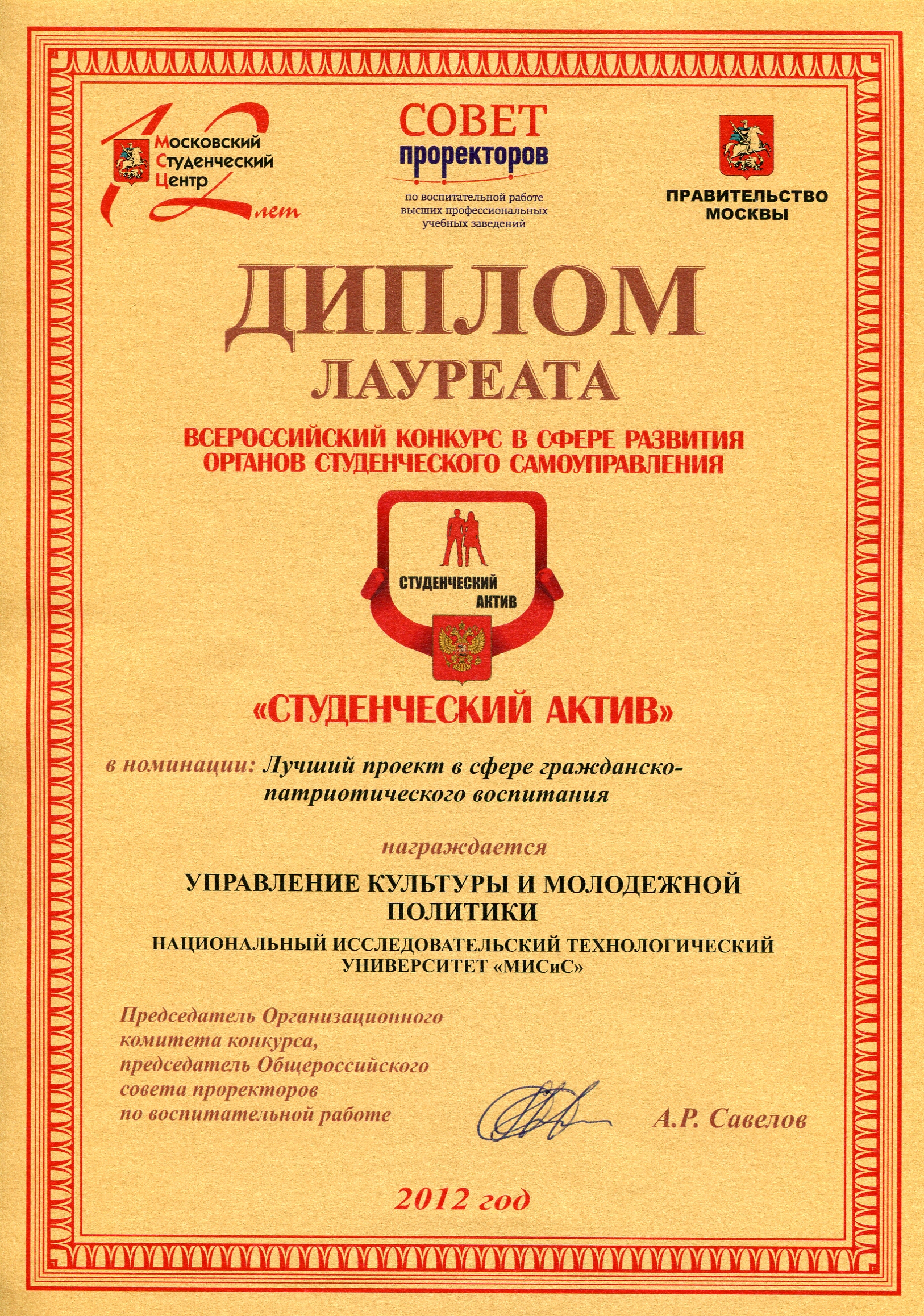 Управление культуры и молодежной политики стало лауреатом во всероссийском конкурсе в сфере развития органов студенческого самоуправления «Студенческий актив» в номинации: