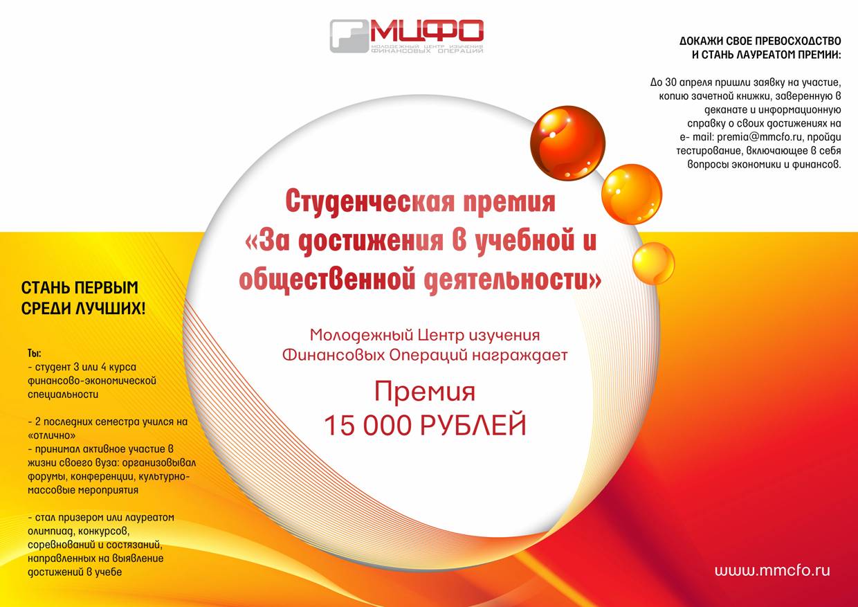 20 марта 2013 годаРазноеМолодежный Центр изучения Финансовых Операций награждает премией 15000 руб. До 30 апреля пришли свою заявку на участие на e-mail: premia@mmcfo.ru.