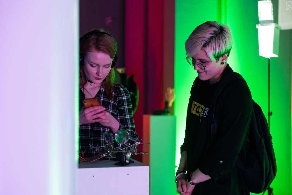 Пространство выставки ArtTECH HYBRID разделено на несколько частей: VR-зона, freezelight и инсталляции, в том числе интерактивные. На торжественном открытии студенты провели кураторские экскурсии и аудиовизуальные перформансы, вызывающие в зрителях целый спектр эмоций.