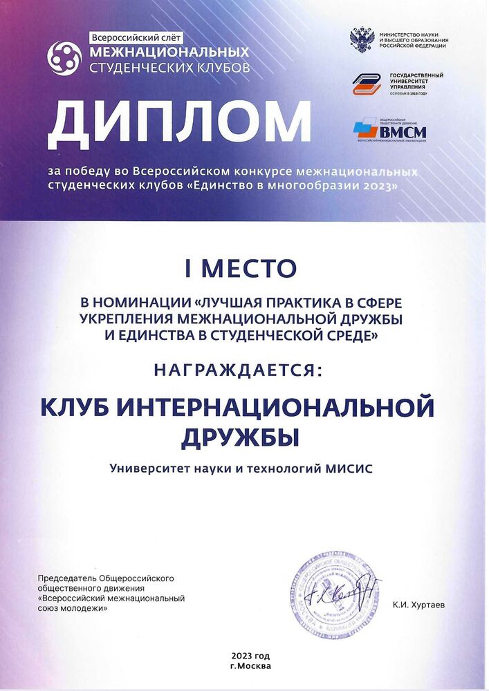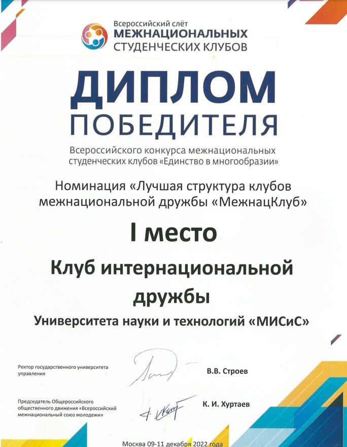Всероссийского конкурса межнациональных студенческих клубов «Единство в многообразии — 2023» в номинации «Лучшая практика в сфере укрепления межнациональной дружбы и единства в студенческой среде»