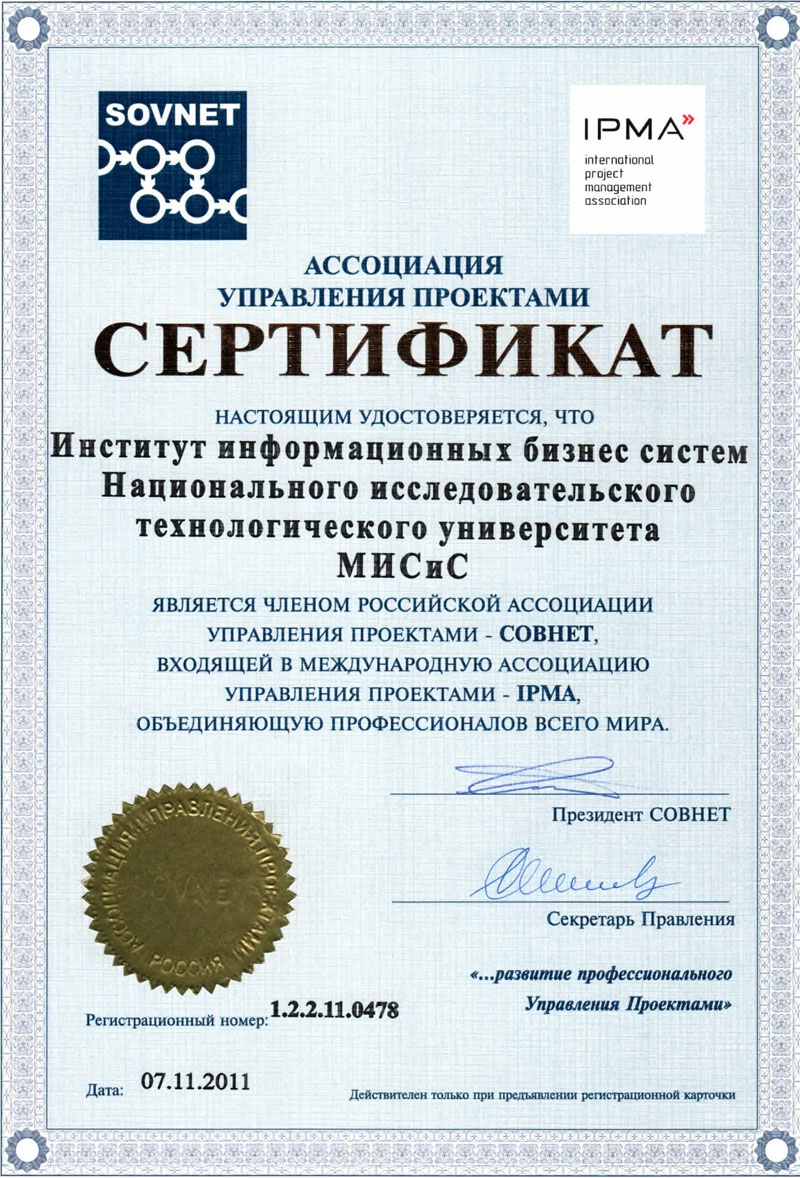 - Сертификат Российской Ассоциации управления проектами «СОВНЕТ» ( рег. номер 1.2.2.11.0478 от 07.11.2011)