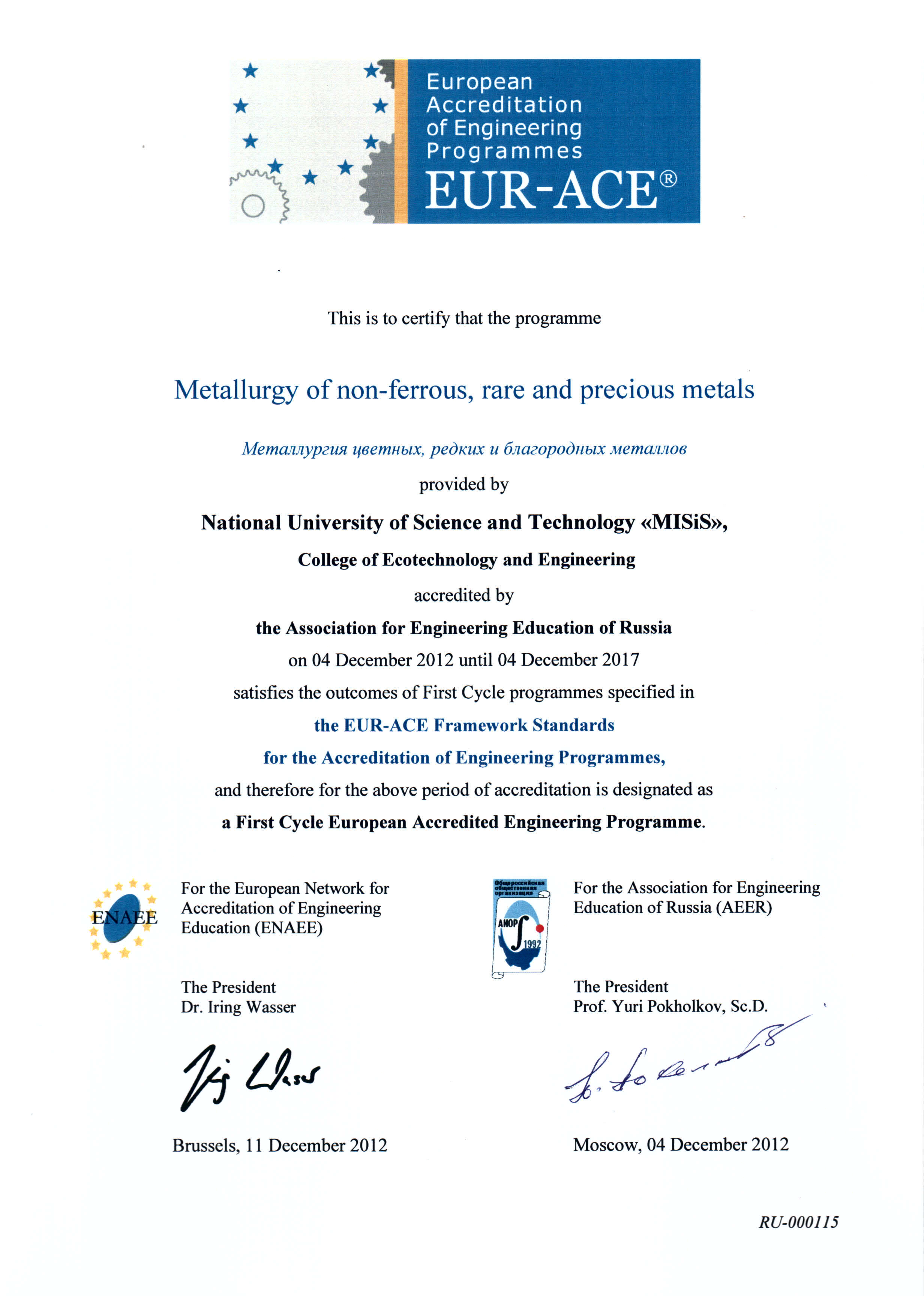 - Сертификат Европейской сети по аккредитации в области инженерного образования (ENAEE) о присвоении «Европейского знака качества» (EUR-ACE® label) от 04.12.2012 г. № RU-000114