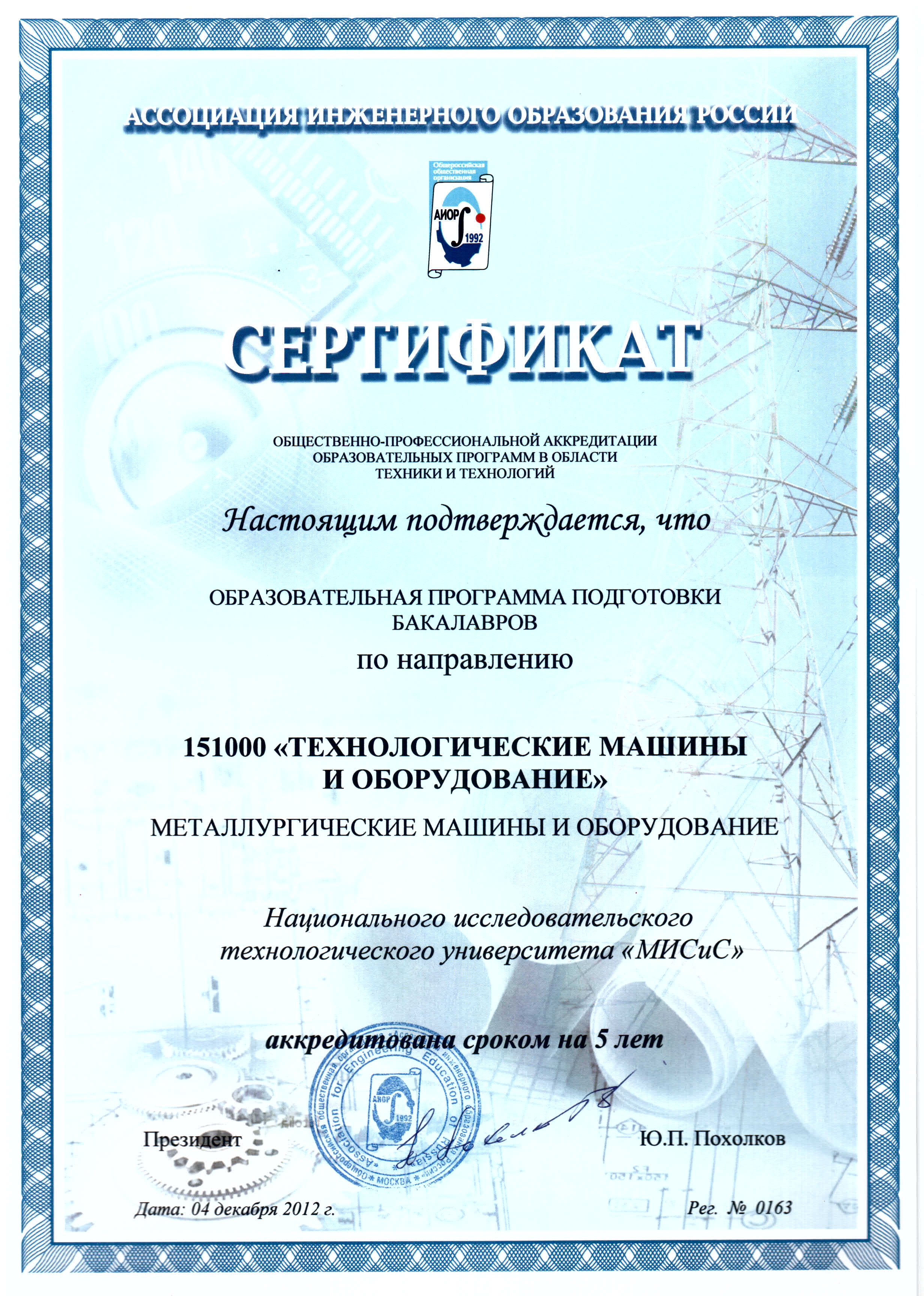 - Сертификат АИОР о прохождении общественно-профессиональной аккредитации образовательных программ в области техники и технологий от 04.12.2012 г. рег. № 0163