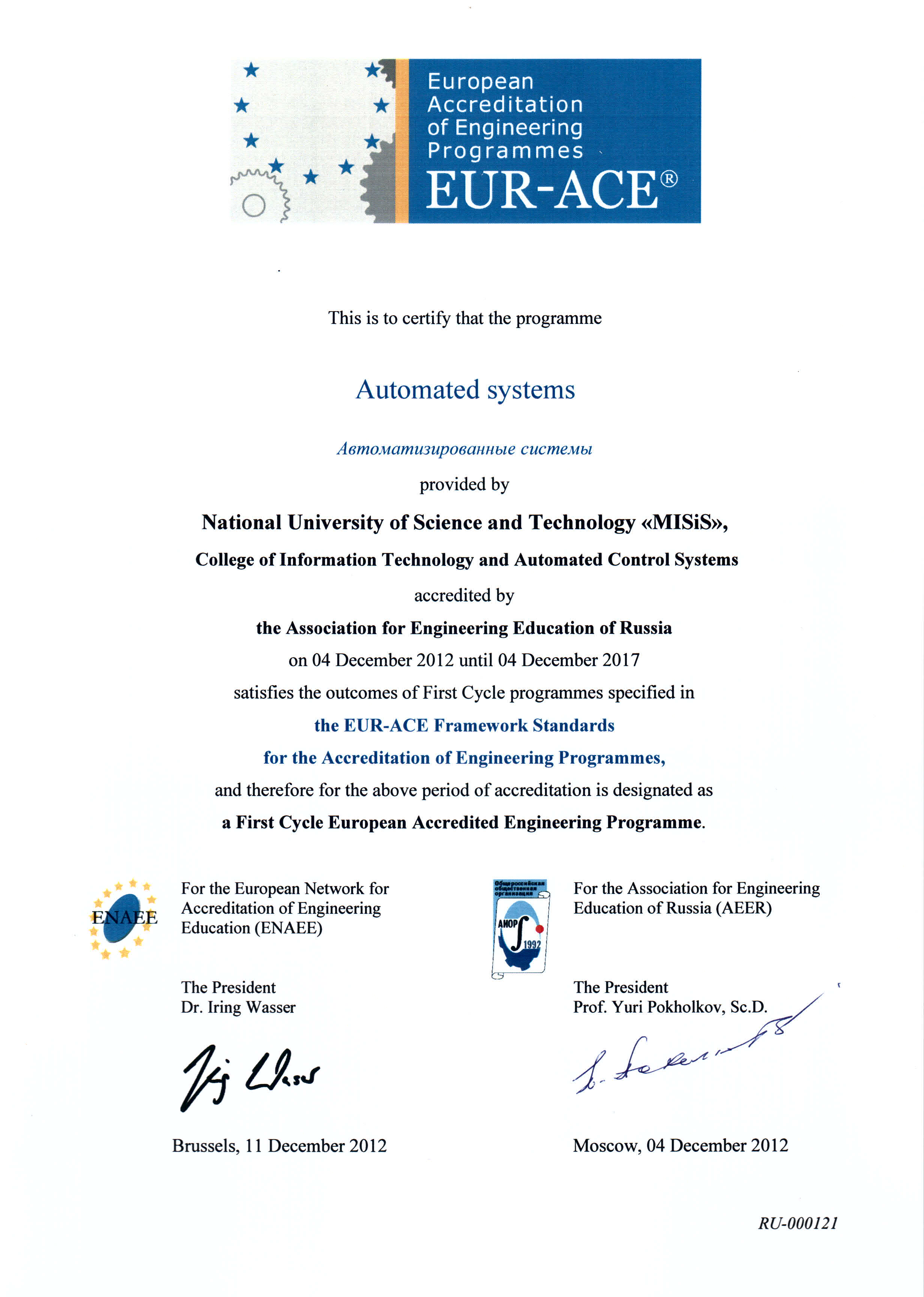- Сертификат Европейской сети по аккредитации в области инженерного образования (ENAEE) о присвоении «Европейского знака качества» (EUR-ACE® label) от 04.12.2012 г. № RU-000119
