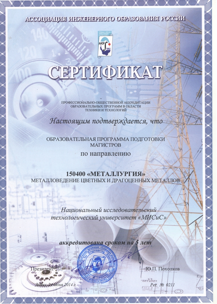 - Сертификат АИОР о прохождении общественно-профессиональной аккредитации образовательных программ в области техники и технологий от 24.06.2014 г. рег. № 0212
