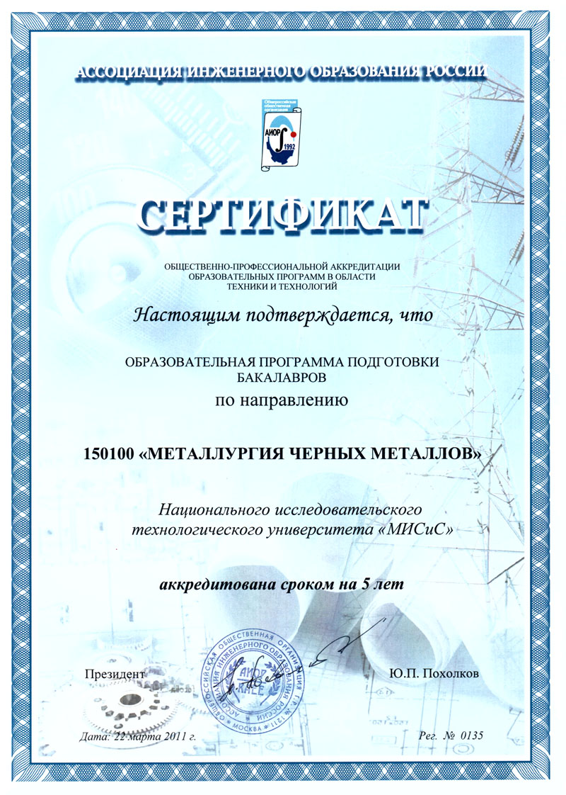 - Сертификат АИОР о прохождении общественно-профессиональной аккредитации образовательных программ в области техники и технологий от 22.03.2011 г. № 0135