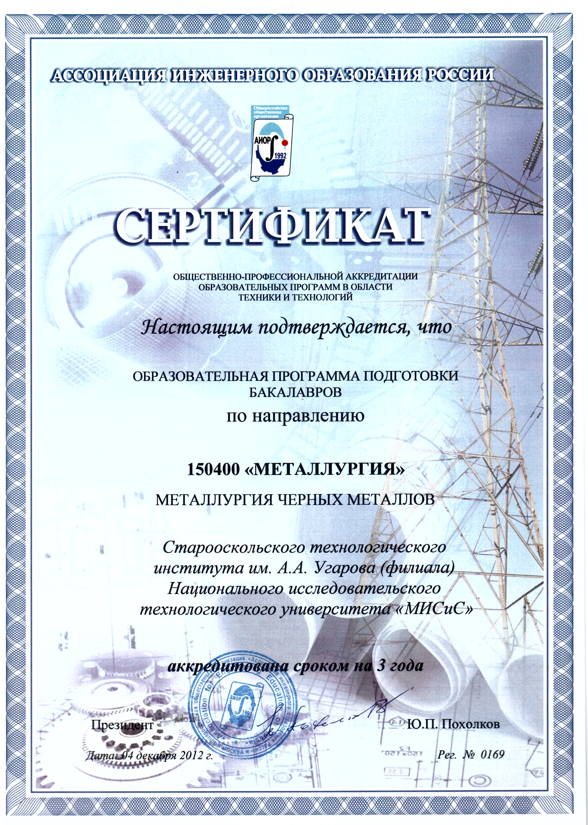 - Сертификат АИОР о прохождении общественно-профессиональной аккредитации образовательных программ в области техники и технологий от 04.12.2012 г. рег. № 0169 (1,2 МБ)